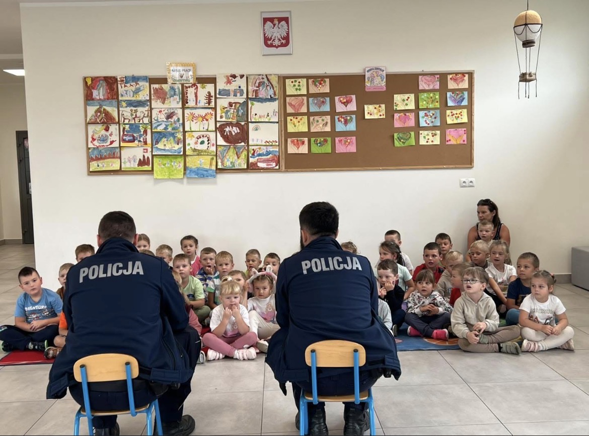 8 września, w ramach edukacji Bezpieczny Przedszkolak, odwiedzili nas policjanci. Podczas spotkania dowiedzieliśmy się jak bezpiecznie poruszać się po drogach, podróżować autem i jeździć na rowerze i hulajnodze. Policjanci zwrócili uwagę na niebezpieczeństwo, jaki może czyhać na dzieci w kontakcie z nieznajomym, przypomnieli, że nie należy z nimi rozmawiać ani wpuszczać do domu. Przedszkolaki czynnie uczestniczyły w spotkaniu, zadawały pytania i dzieliły się swoimi spostrzeżeniami i doświadczeniami. Dużą atrakcją było oglądanie policyjnego auta.