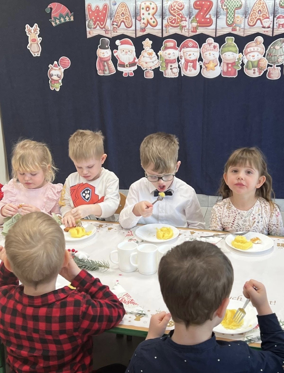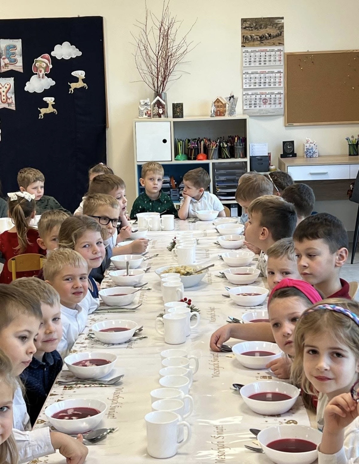 18 grudnia w naszej przedszkolnej rodzinie, panowała radosna i ożywiona atmosfera jak w każdym domu w dzień Wigilii. Świąteczne dekoracje, dzieci w galowych strojach wprowadzały nastrój oczekiwania na wyjątkowe wydarzenie. Dzieci zjadły wspólnie wigilijny obiad i świąteczne pierniczki na deser. Po południu odbyły się świąteczne występy przedszkolaków, na które zaprosiliśmy rodziców.